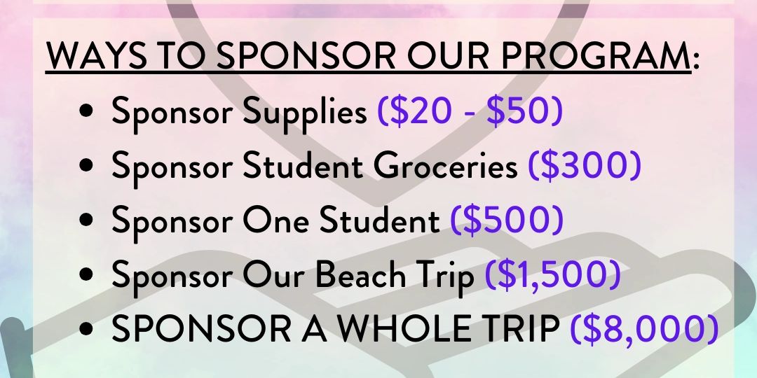 It costs about $500 to send one student to our program. This amount covers the cost of lodging, food and transportation to local areas. We offer our students to attend for a reduced fee to allow more students the opportunity to attend our program!