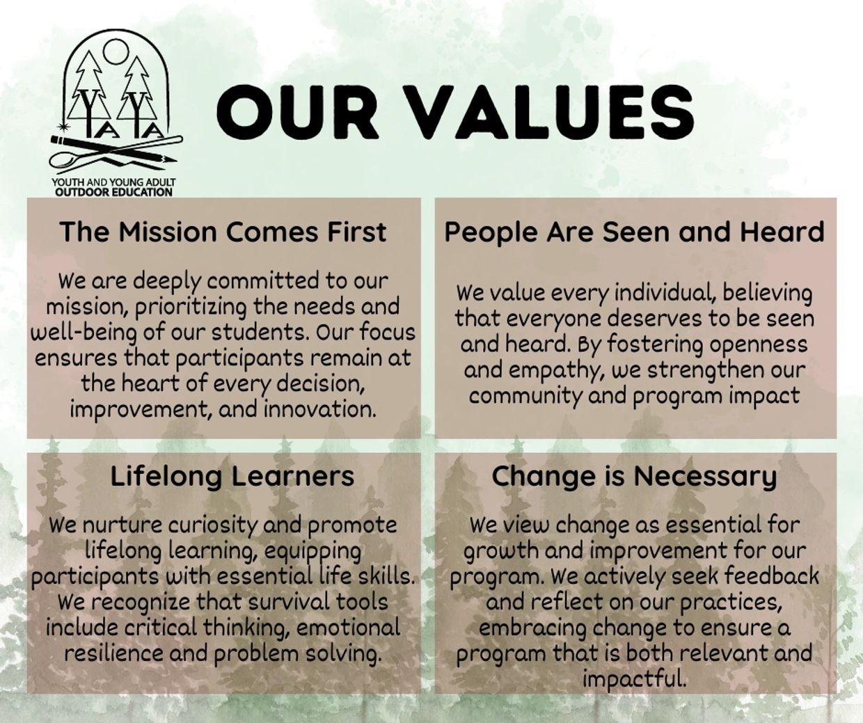 Youth and Young Adult Outdoor Education (YAYA Outdoor Ed) is committed to offering a dynamic curriculum designed for older students. Our program empowers high school students with the tools for social-emotional regulation and overall wellbeing and equips them with skills to prepare and serve delicious, home-cooked meals using fresh, high-quality ingredients. At YAYA Outdoor Ed, students learn the significance of Leave No Trace (LNT) practices and engage in environmental stewardship, and above all, we strive to create a space where students can reflect on various aspects of their identity.